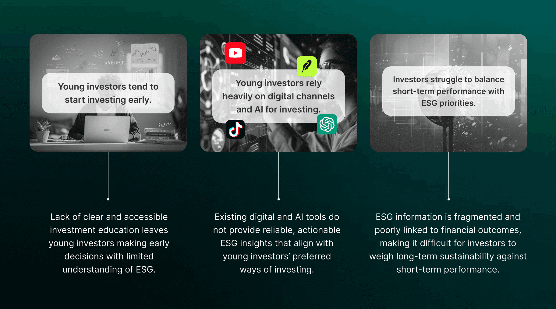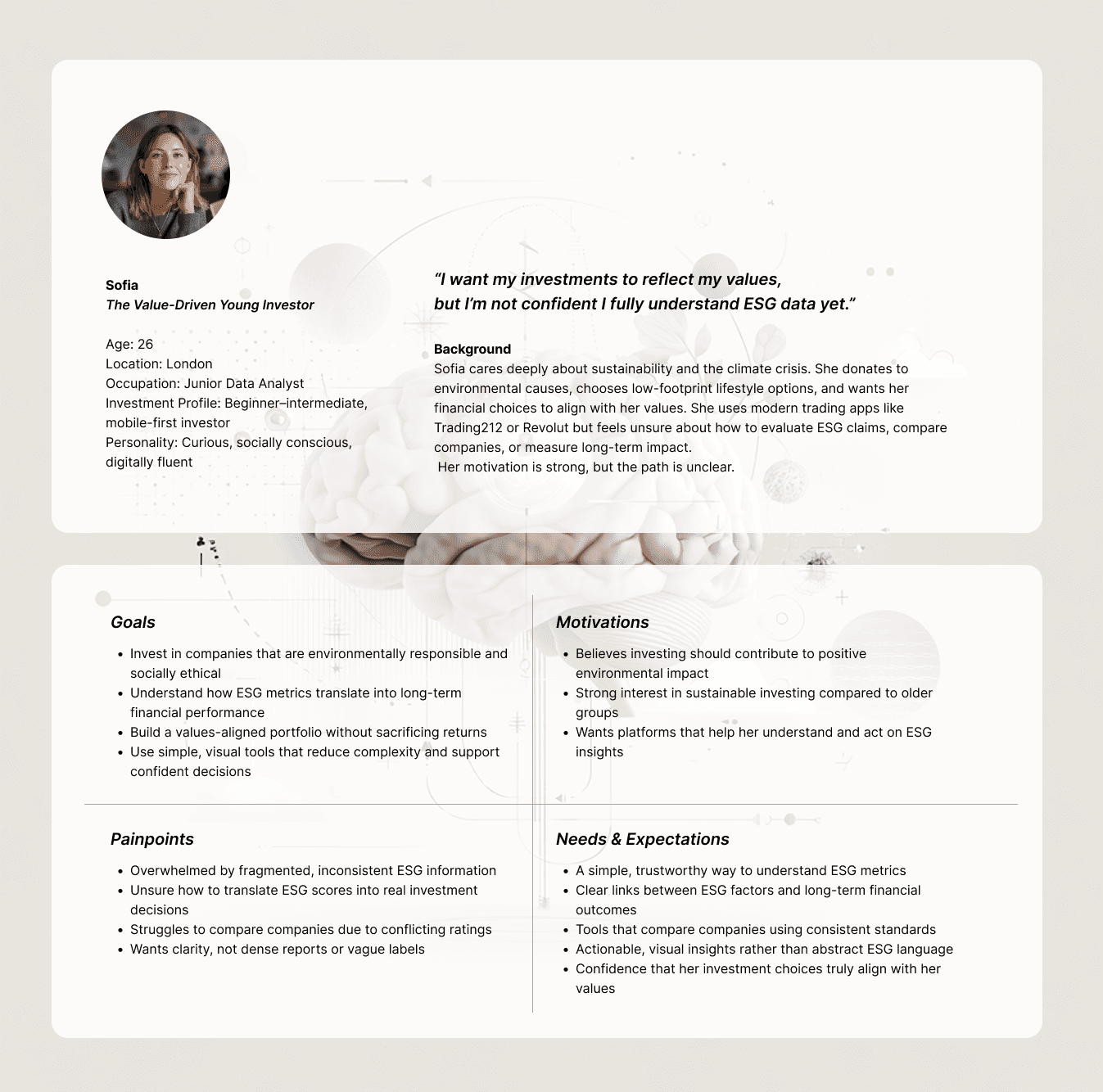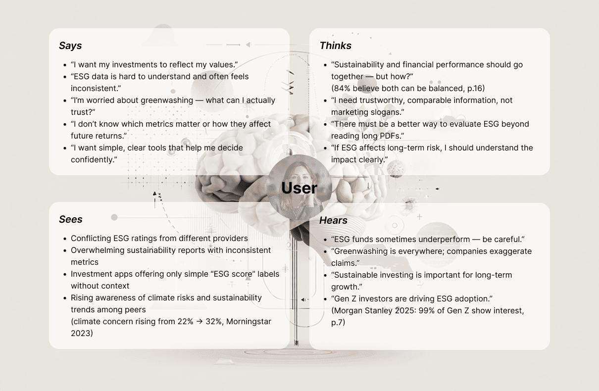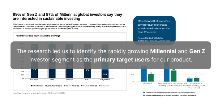 The secondary research, drawing on reports from EY, Morgan Stanley, and McKinsey, helped identify our target users and clarify their core need for clearer, more actionable support for ESG investing.