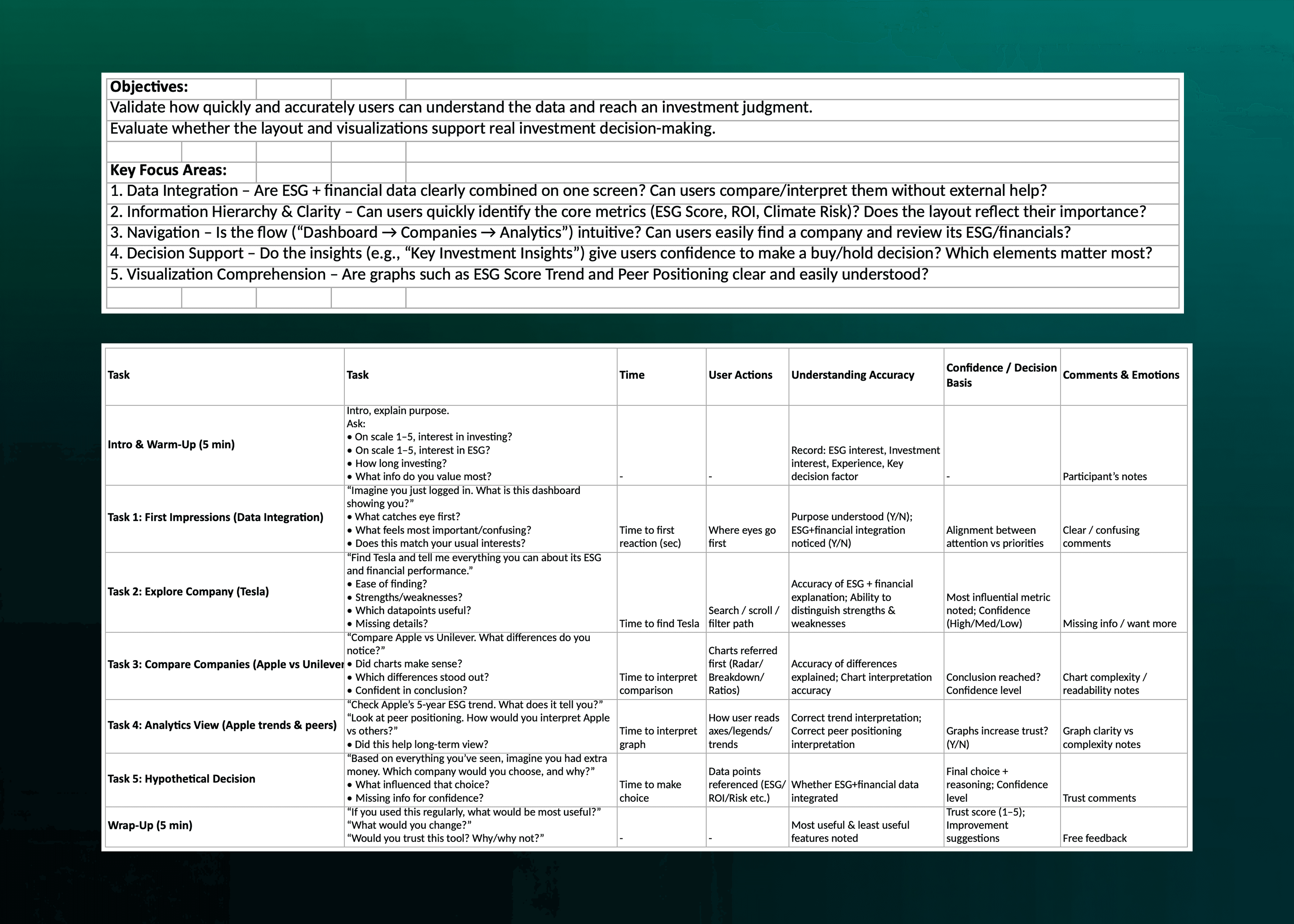 I conducted remote usability testing with two participants interested in investing and ESG. Each session lasted around 30–40 minutes and included five tasks. The focus was on evaluating the visual hierarchy, the clarity of data visualizations, and how effectively the dashboard supported investment decision-making confidence.