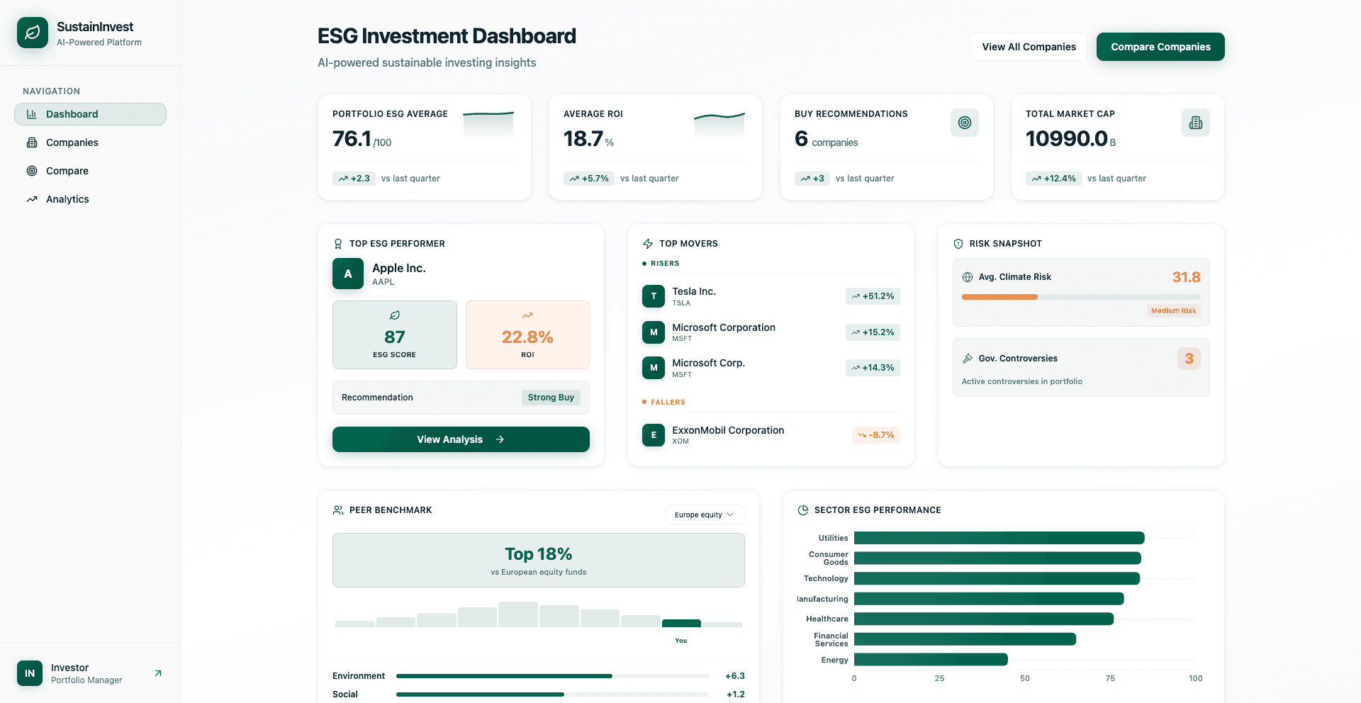 Provide an at-a-glance overview of portfolio performance, top movers, and sector-level ESG insights.