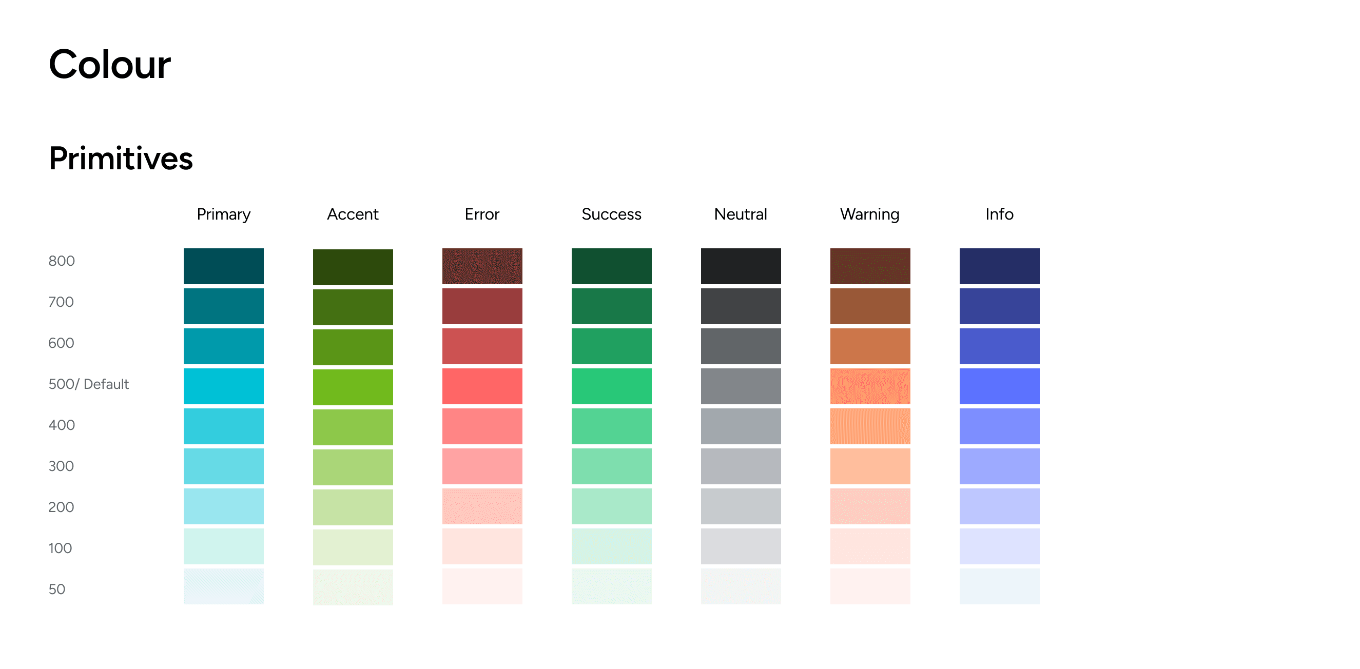 I built the colour system by separating primitives from semantic roles. Primitive colours define the raw palette, while semantic tokens assign meaning based on usage—such as text, icons, surfaces, and borders.