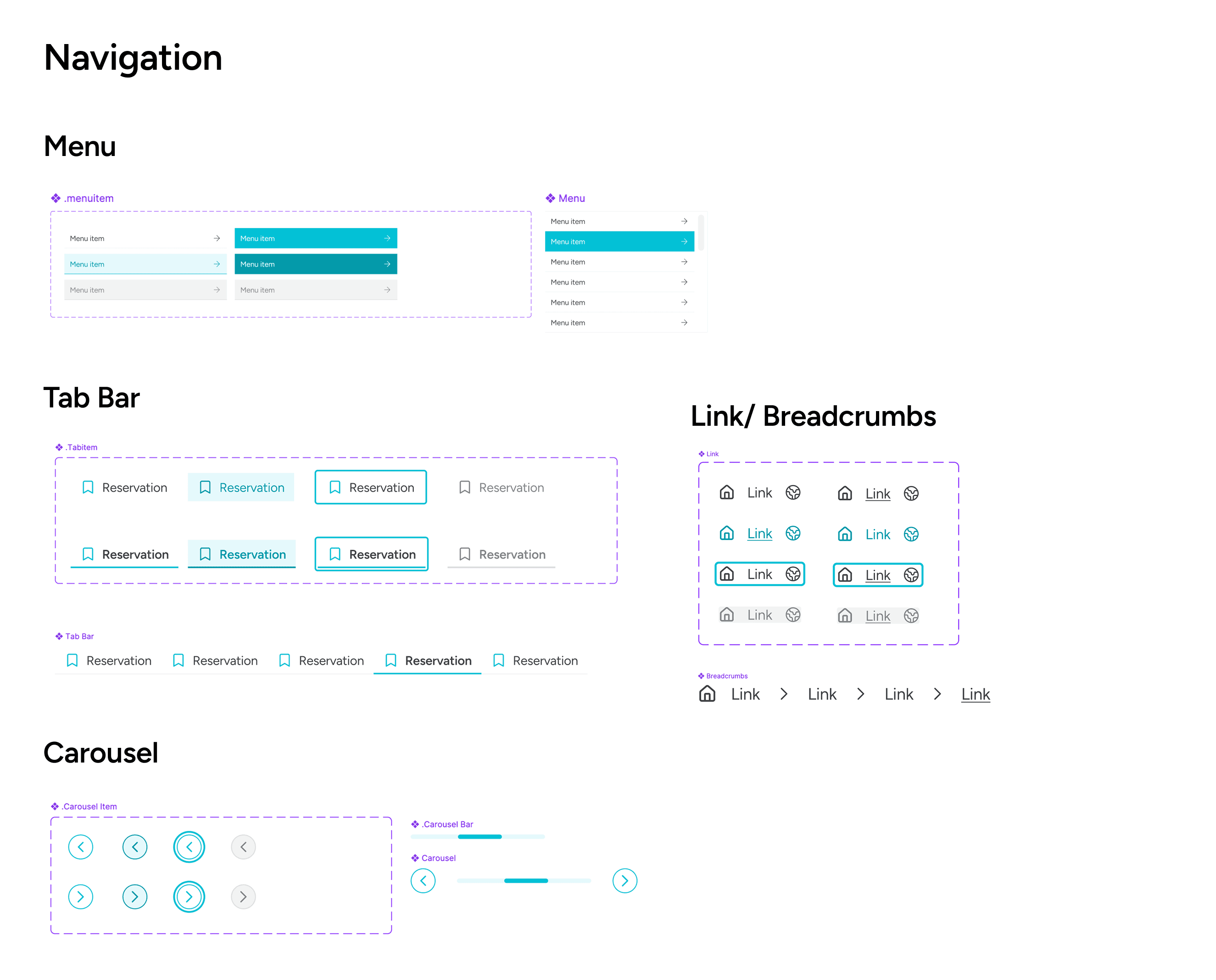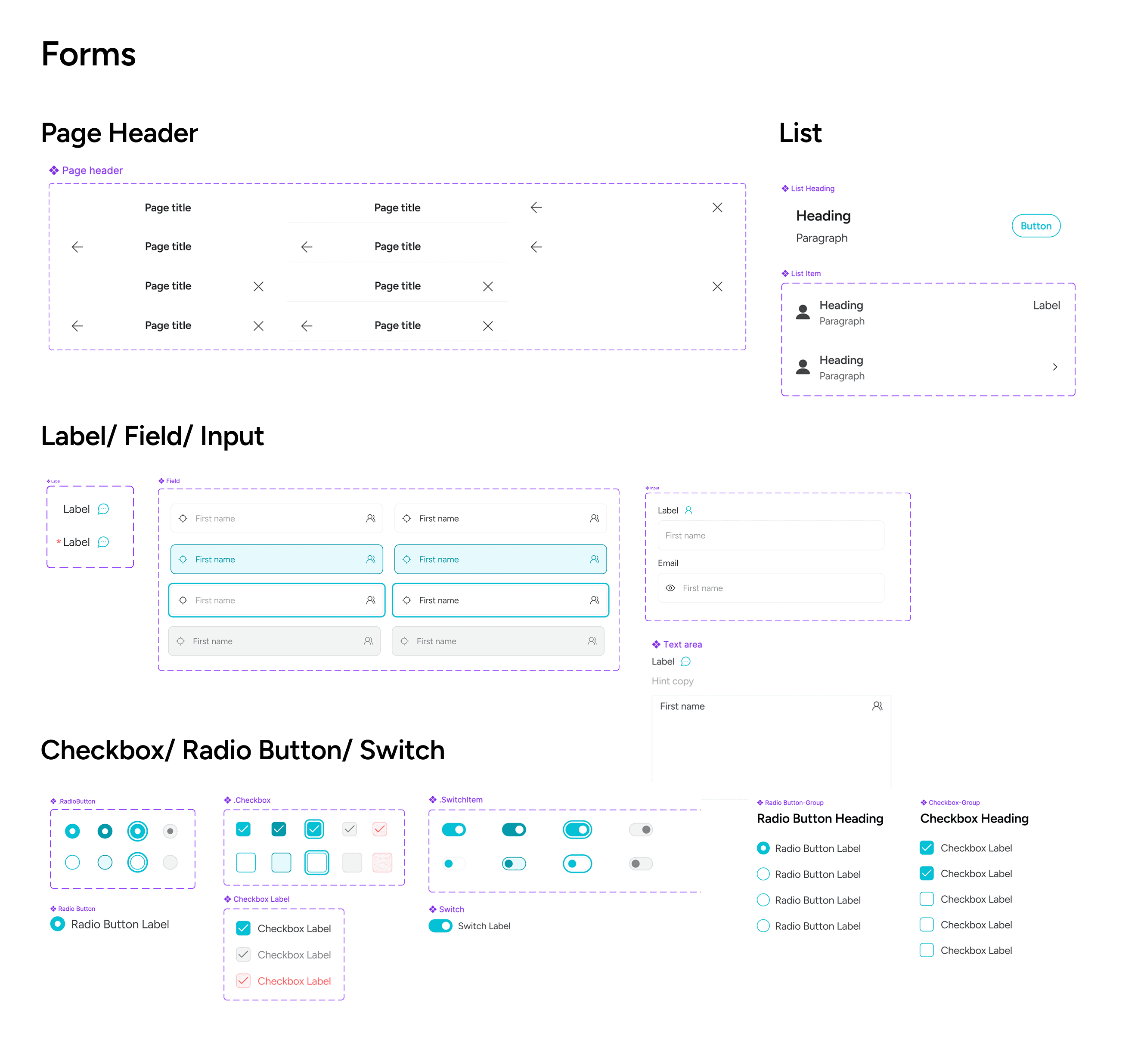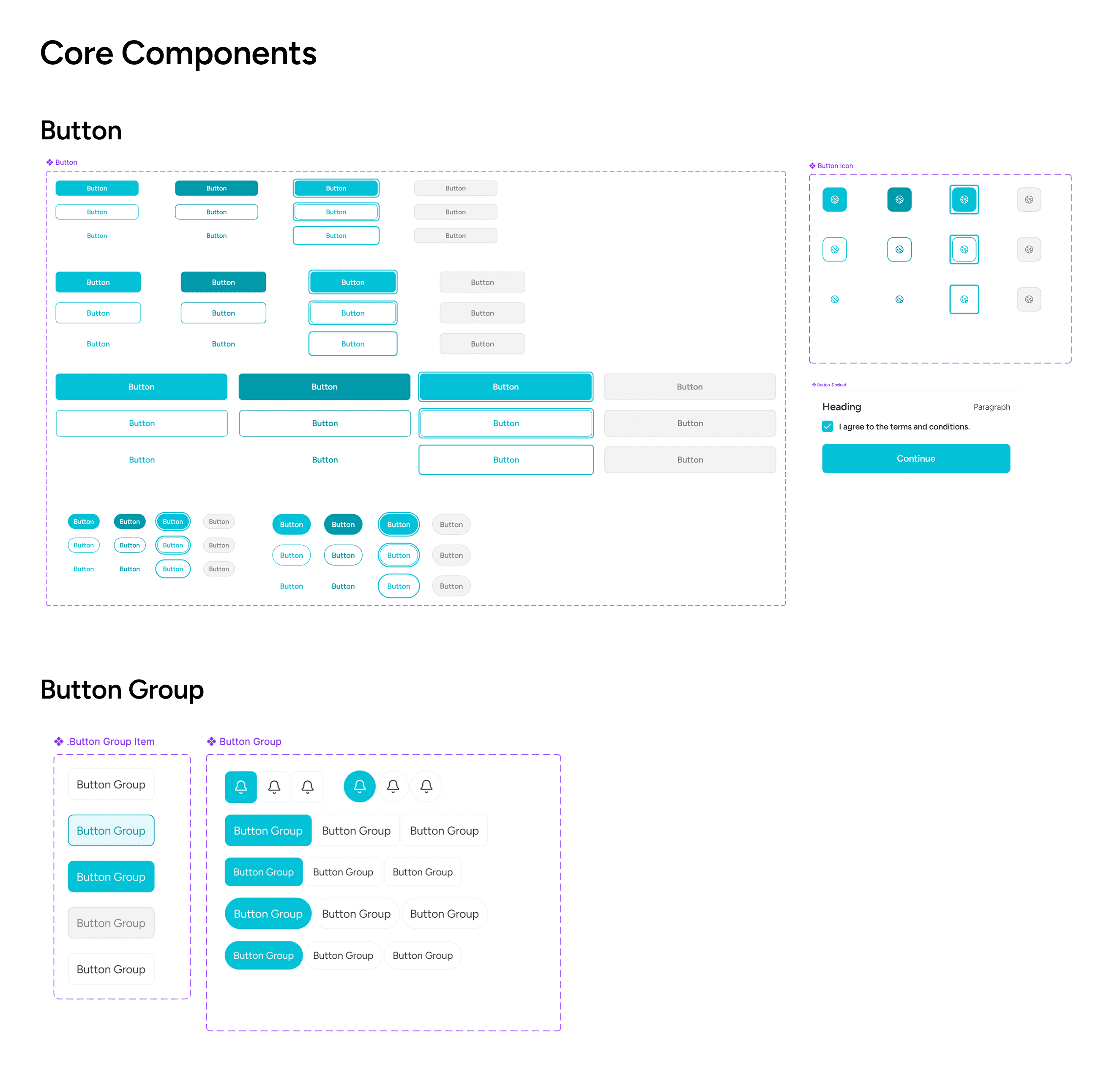 I began with foundational components such as buttons, then expanded the system to include navigation elements, indicators, and form components.
