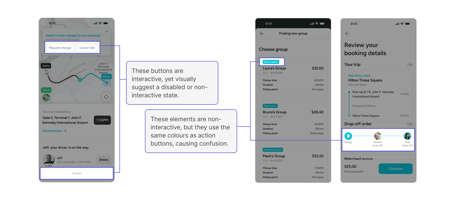 Interactive elements and non-interactive components often shared similar colours. This made it difficult for users to quickly recognise what was clickable, reducing clarity and increasing cognitive load.
