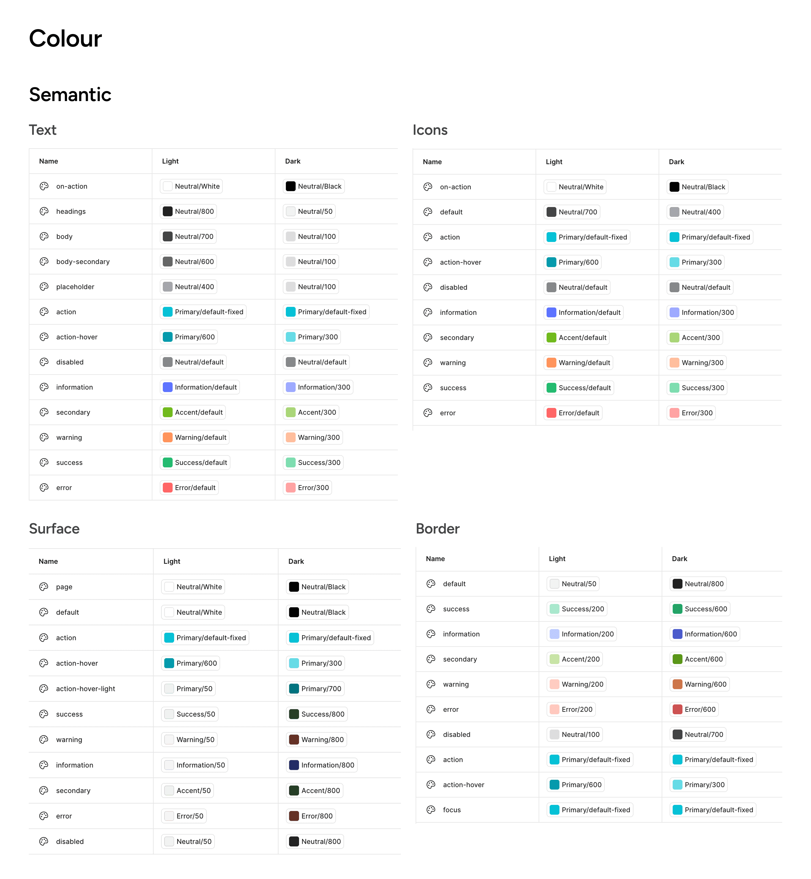 Each semantic role is further structured by function (e.g. default, action, error, warning, success), allowing colours to consistently communicate state and intent across the product. This approach reduced ambiguity in UI decisions and ensured that colours were used to reinforce function rather than decoration.